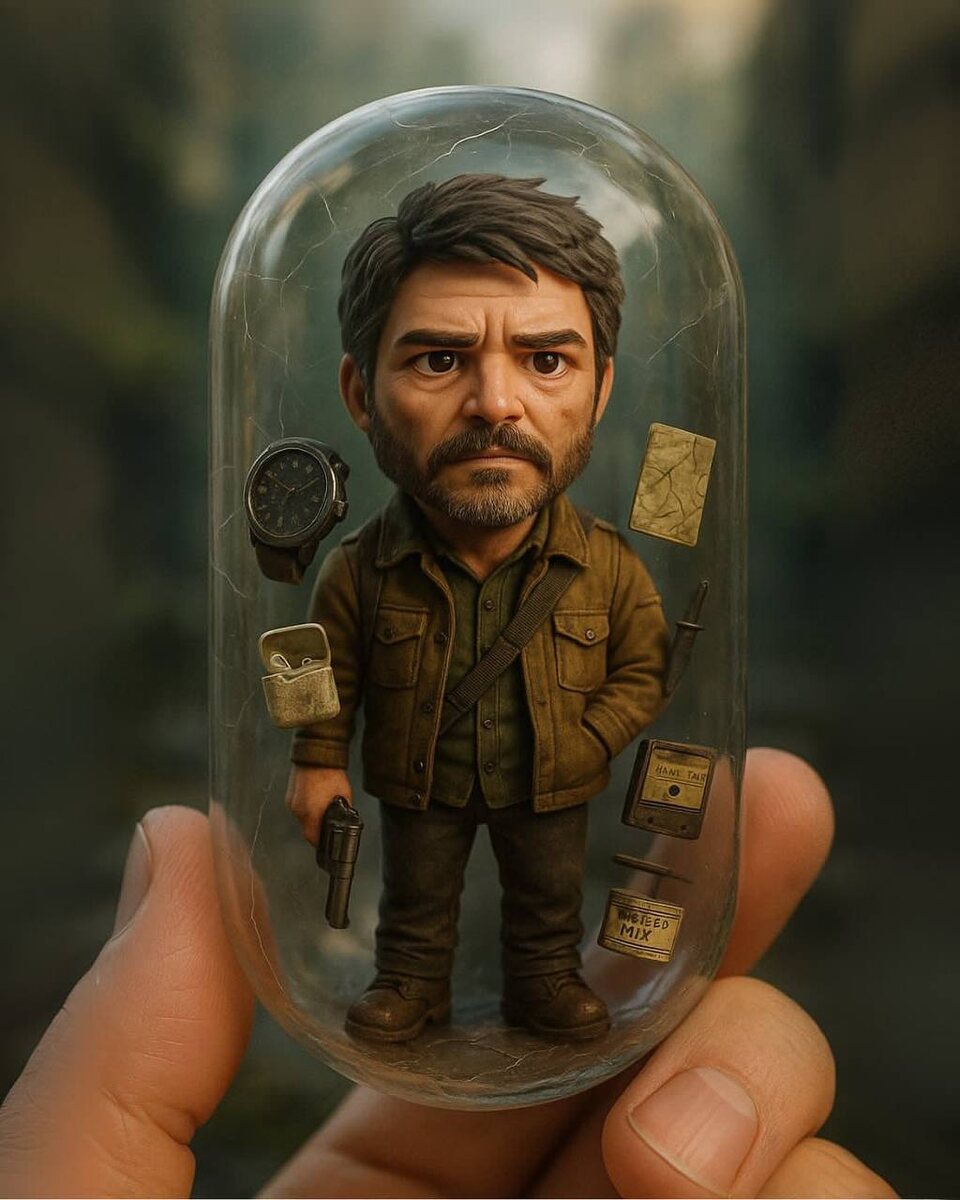 Вторую серию уже все смотрели The Last of Us’? Промт: A hyper-realistic miniature figurine of Joel from ‘The Last of Us’, trapped inside a cracked transparent capsule. He has rugged hair, a beard, a serious expression, wearing a green shirt and a brown hunting jacket. Holding a revolver in his hand. Floating around him inside the capsule: an old wristwatch, a worn-out lighter, a tattered map, a radio device, and a small metal can labeled ‘Infected Mix’. Post-apocalyptic atmosphere, overgrown ruins blurred in the background. Warm lighting, ultra-detailed textures, cinematic depth of field. 🎁 Вот это да! | Подписаться