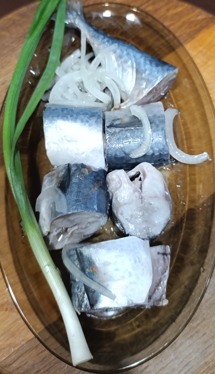 Ингредиенты: скумбрия 1 кг лук 200 гр соль 2 ст л сахар 2 ст л уксус 2 ст л раст масло 2 ст л перец горошком 0,5 ч л перец горошком 1 ч л гвоздика 0,5 ч л вода 2 стакана Скумбрию очищаем от внутренностей (обязательно удаляем черную пленку внутри - она горчит), отрезаем голову, моем и нарезаем кусочками. Воду закипятить, добавить все ингредиенты, варить минуты 3 и полностью остудить рассол. Лук нарезать полукольцами. Далее выложить в банку скумбрию чередуя ее с луком. Залить остывшим рассолом. Оставить на 1 сутки при комнатной температуре, а потом поставить в холодильник и кушать при необходимости. Если рассол помутнеет, появится осадок - не переживайте, на качестве маринованной скумбрии это не скажется: это просто с рыбы попала некипяченая вода. Не страшно. Самое длительное хранение у меня было - 3 недели - не испортилась. В случае, если у Вас крупная скумбрия, то ее лучше при разделке разобрать на филе. Выложить в плоскую посуду, залить рассолом. Далее все по рецепту. Но на стол у