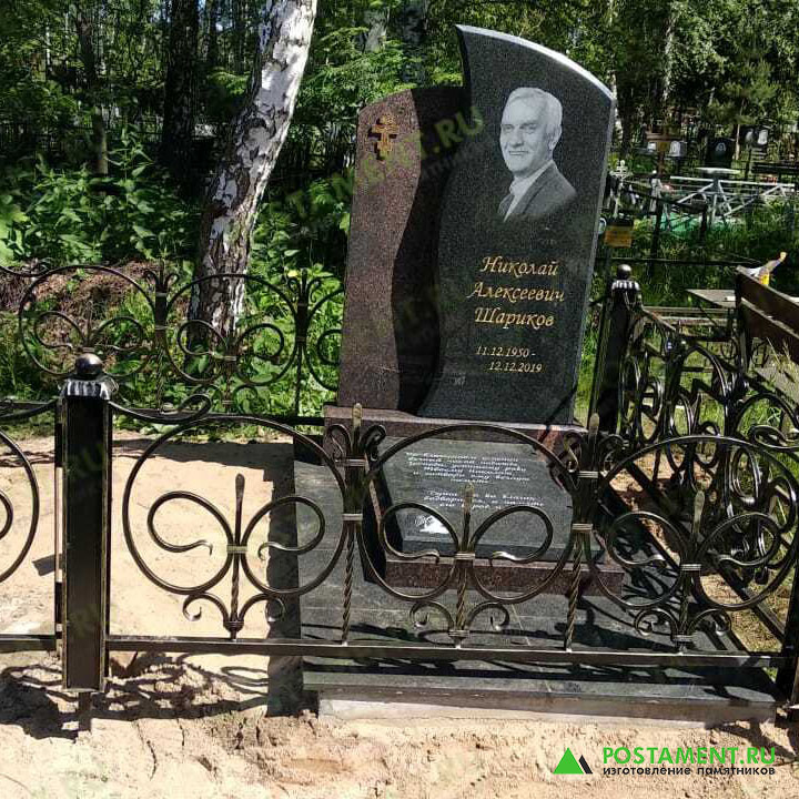 В безмолвии покоя, где земля хранит свои тайны, возвышается памятник, словно застывшая песнь скорби. В его создании сплелись два благородных камня: коричневый Дымовский гранит, теплый и живой, как воспоминания, и черный Габбро-Диабаз, холодный и строгий, как сама вечность. Они гармонично дополняют друг друга, рождая образ завершенности и достоинства. Фигурная стела, искусно составленная, притягивает взгляд своей необычной формой и глубокой цветовой палитрой. На фоне дымовского камня, словно отблеск заходящего солнца, сияет накладной медный крест, символ веры и надежды. Строгая черная стела хранит лик ушедшего, запечатленный лазерным гравером с ювелирной точностью. Слова эпитафии, нанесенные с любовью вручную, вспыхивают сусальным золотом, словно драгоценные слезы, застывшие на камне. Кованая ограда, словно кружево, сплетенное из металла, завершает это место последнего пристанища. Кованые детали, созданные из прочного сплава, устойчивого к неумолимому времени, обещают долгий век безмяте