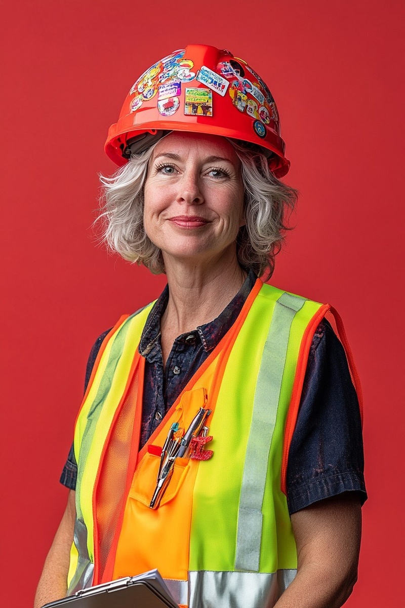Создано на основе запроса: A mid-chest up portrait of a 44-year-old White woman dressed as a roller coaster engineer, standing in front of a solid bright neon red background or soft candy apple gradient. Safety vest, colorful hard hat covered in stickers, clipboard under one arm. Subtle neon red and silver accents. Closed-mouth smile, facing directly at the camera. Sharp studio lighting, vibrant costume tones, clean simple background. Styled like a network game show contestant promo photo. Mid-chest framing, cinematic energy, playful yet professional tone. Studio photography look. --- Автоперевод: Портрет в середине килограмма 44-летней белой женщины, одетой в качестве инженера на американских горках, стоящих перед твердым ярким неоновым красным фоном или градиентом яблока мягких конфет. Интересно вышло? 🤔 https://dzen.ru/id/65c0c65c86e4f837c27b24d7 #ИИ #AI #нейросеть #midjourney #art