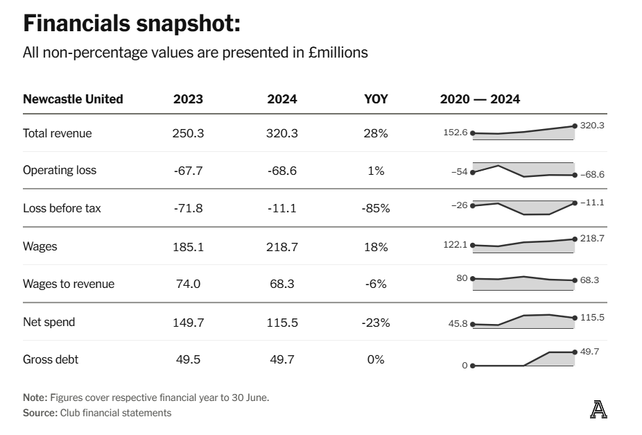 Финансовая отчётность «Ньюкасла» за последние сезоны выглядит… скажем так, не как сказка про золотую рыбку, но и не как хроника банкротства. За трёхлетний цикл прибыли и устойчивости (Profit and Sustainability, PSR) с 2022 по 2024 год клуб показал совокупный убыток до налогообложения в £155,8 млн — а это, мягко говоря, впритык к разрешённому лимиту в £105 млн. Чтобы уложиться в норматив, нужно было где-то наскрести чуть больше £50 млн вычитаемых расходов. Миссия почти невозможная — если не считать бухгалтерию лёгким видом экстрима.