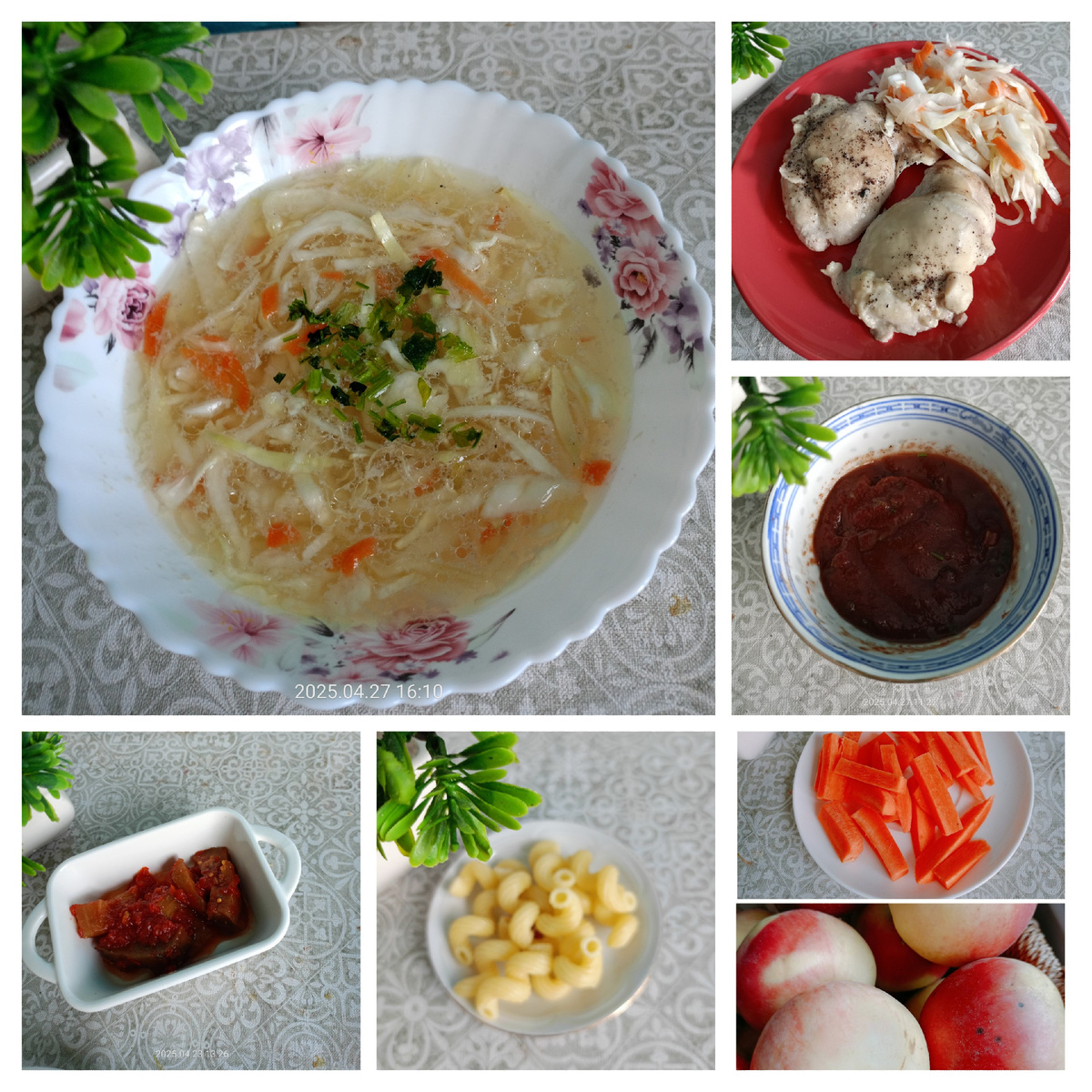 Обед - бульон куриный с квашеной капустой; баклажаны маринованные в томате; макароны вместо хлеба.