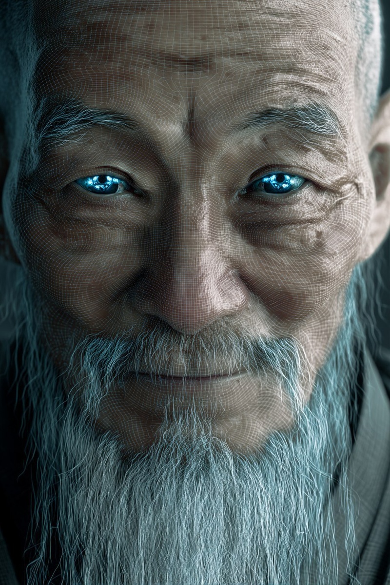 Создано на основе запроса: old and sage cyber shaolin monk, frontal view, old wise man bearer of wisdom with cyber beautiful eyes looks me