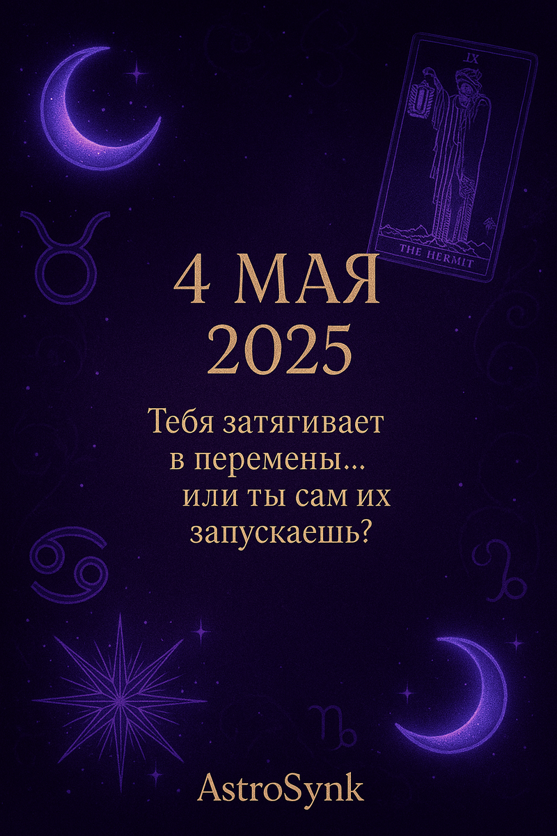 Сегодня энергия будто скребёт изнутри: что-то назревает, колышется, дрожит — как перед бурей. И это не разрушение, а шанс. Если ты не сделаешь шаг — шаг сделает за тебя Вселенная. 4 мая — день, когда или ты управляешь переменами, или они управляют тобой. ♈ Овен Ты чувствуешь: пора иначе. Но ты готов(а) на это “иначе”? 💰 Финансы: Риск может принести выгоду, если не импульсивный. ❤️ Любовь: Не бойся сказать правду — она освободит. 🃏 Карта дня: Башня — неожиданности, очищение, крах старого. 🎨 Цвет дня: Алая сталь. 🔮 Аффирмация: «Я позволяю переменам обновить мою жизнь.» ♉ Телец Ты хочешь спокойствия — но за этим желанием прячется скука. 💰 Финансы: Хороший день для закрытия старых трат. ❤️ Любовь: Важно быть честным(ой) — даже если не удобно. 🃏 Карта дня: Справедливость — равновесие, выводы, зрелость. 🎨 Цвет дня: Глубокий графит. 🔮 Аффирмация: «Я принимаю свои решения с ясностью и честностью.» ♊ Близнецы В тебе назревает что-то гениальное. Но хватит ли тебе фокуса? 💰 Финансы
