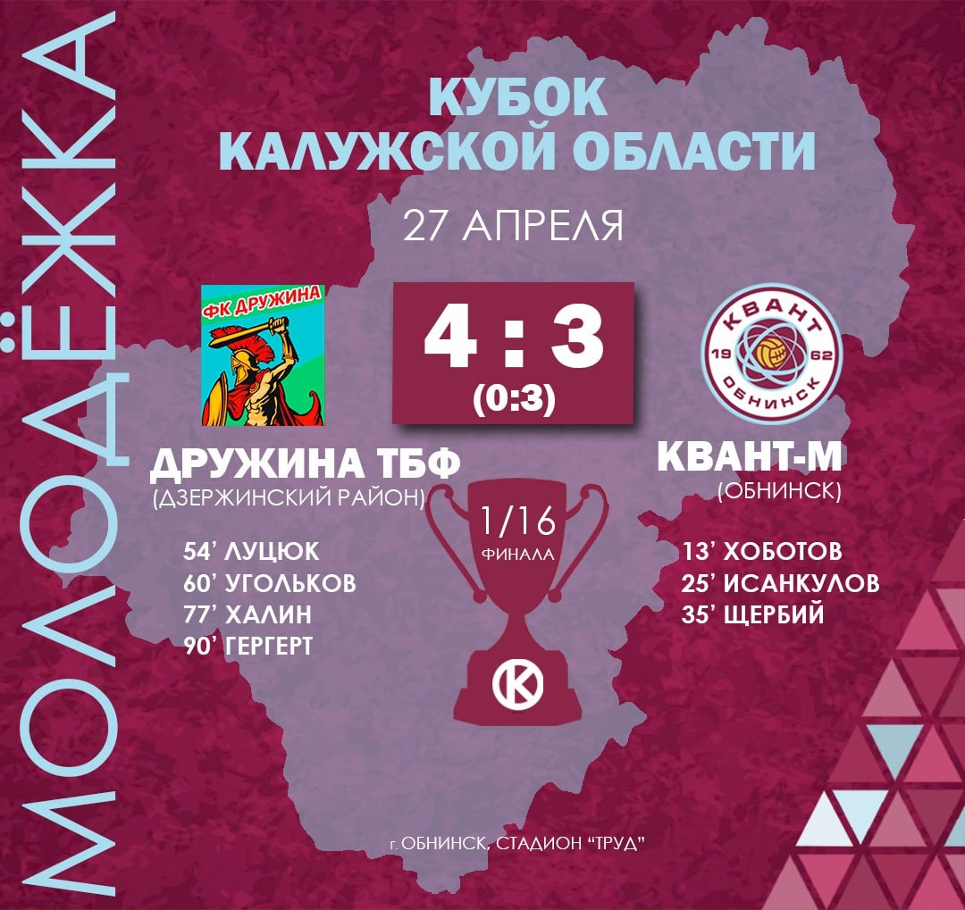Вот это камбэчище сегодня был на стадионе Труд. Жаль, что не в нашу пользу. Молодёжка Кванта в 1/16 финала Кубка области вела после первого тайма со счётом 3:0 у "Дружины ТБФ". Но потом что-то сломалось. Иван Меркулов схлопотал удаление на 50-минуте, а затем Квант-М рассыпался. В итоге подопечные Александра Яковлева покидают турнир на первой стадии.