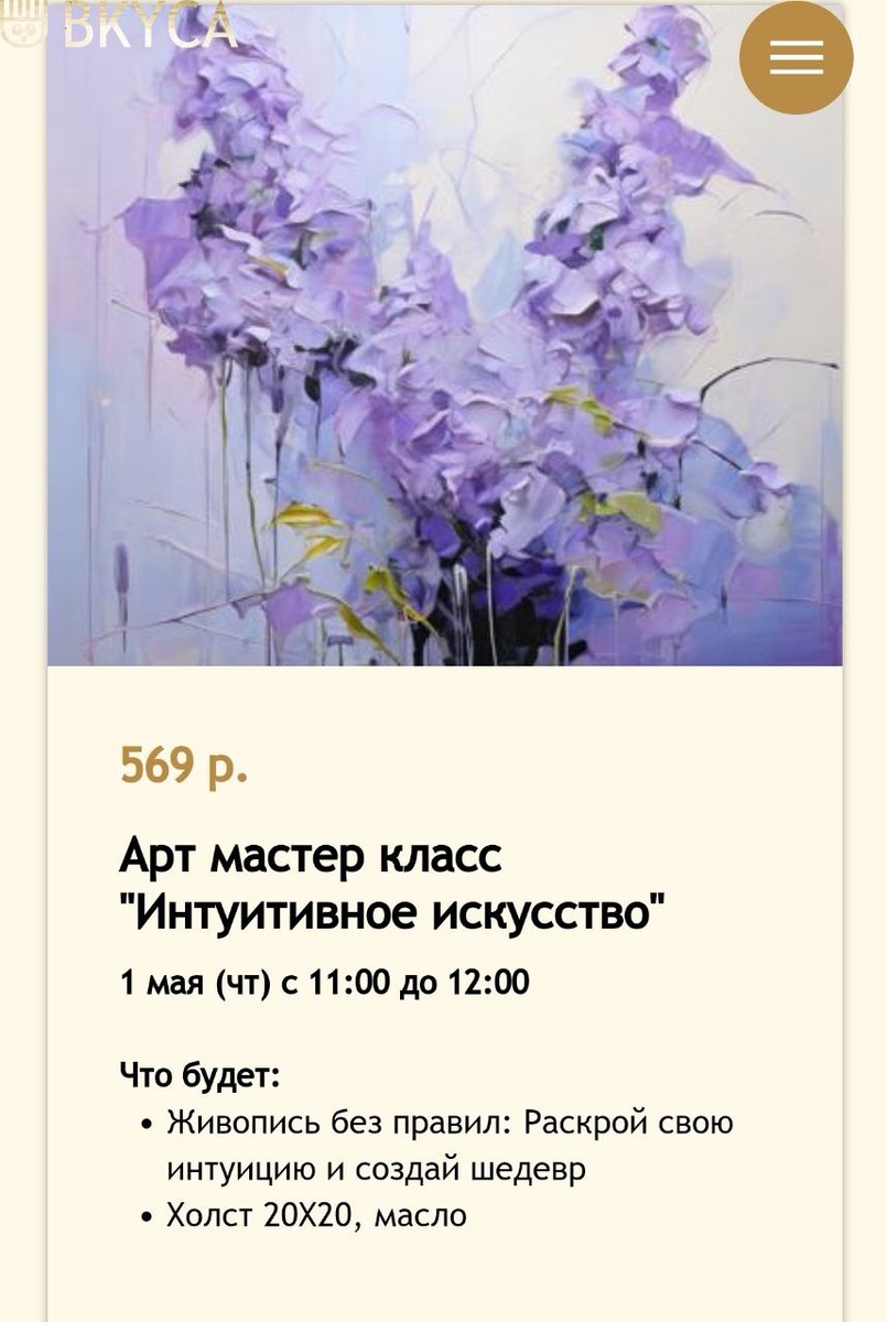 Кулинарная студия "Мастерская Вкуса" приглашает вас на уникальные арт-мастер-классы по интуитивной живописи! Дайте волю своим чувствам и создайте собственный шедевр, даже если никогда раньше не держали кисть в руках. 🗓️ С 1 по 4 мая ⏰ Два времени на выбор: 13:00 и 21:00 🖌️ Холст 20х20, профессиональные масляные краски 💸 Цена: всего 569 руб! Почувствуйте себя настоящим художником! Бронируйте место прямо сейчас на нашем сайте или пишите в сообщения! Ждем вас! https://masteroftaste.ru/party