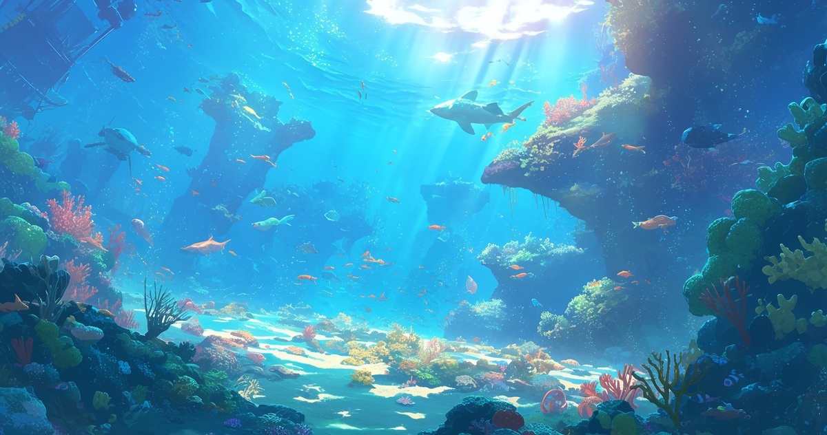 Создано на основе запроса: An underwater scene with vibrant coral reefs, colorful fish swimming around, and sunbeams filtering through the water's surface. In the background is an open sea filled with various marine life, creating a magical atmosphere. The style of painting should be in a cartoon or anime art form, capturing a sense of wonder at exploring new worlds under the ocean. --- Автоперевод: Подводная сцена с яркими коралловыми рифами, красочная рыба, плавающая вокруг, и солнечные лучи фильтрации через поверхность воды. Неплохо получилось? 🤔 https://dzen.ru/id/65c0c65c86e4f837c27b24d7 #ИИ #AI #нейросеть #midjourney #art