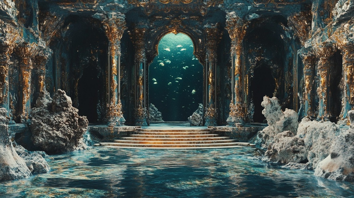 Создано на основе запроса: Fantasy underwater realm interior in the style of roal theater decorations