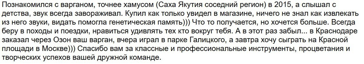 Спасибо вам за тёплые отзывы на наши варганы! Каждый ваш сторис, пост, отметка и просто доброе слово — вдохновляет нас продолжать делать качественные инструменты и развивать варганную культуру. Очень приятно видеть, как варганы находят отклик в сердцах — кто-то открывает для себя новый звук, кто-то медитирует, кто-то просто кайфует от вибраций.