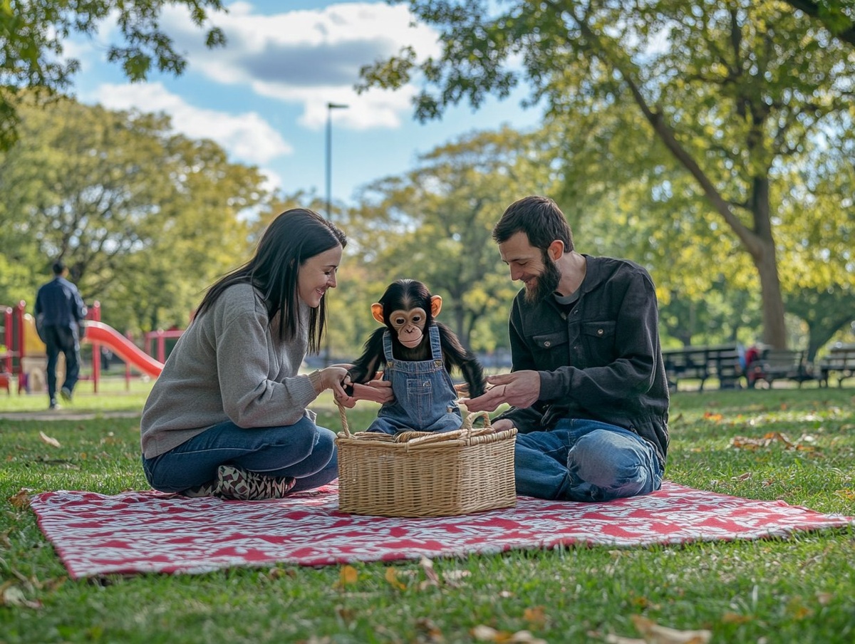 Создано на основе запроса: a photograph of a man and woman with a small young chimpanzee wearing human clothing. The people are wearing casual clothing. The chimpanzee is wearing overall jeans and a t-shirt They are having a picnic in a public park on a red and white patterned blanket and a wicker picnic basket. There are joggers and a playground in the background. There are maple trees providing shade. Sunny sky with a few clouds. Sony A65 camera. --- Автоперевод: Фотография мужчины и женщины с маленьким молодым шимпанзе в человеческой одежде. Неплохо получилось? 🤔 https://dzen.ru/id/65c0c65c86e4f837c27b24d7 #ИИ #AI #нейросеть #midjourney #art
