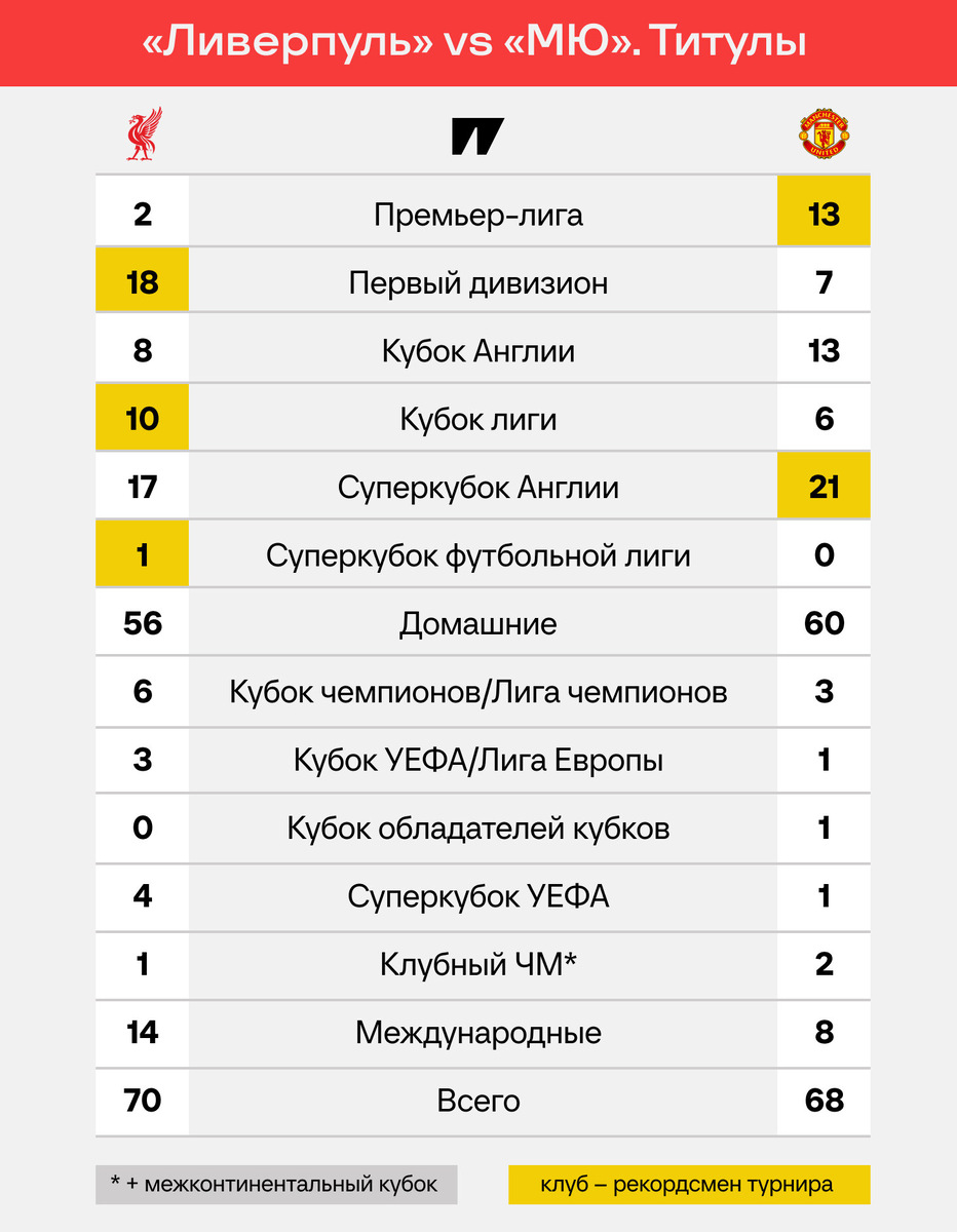 Считаем трофеи, очки и голы. «Ливерпуль» выиграл 20-й чемпионат Англии и сравнялся по чемпионствам с «Манчестер Юнайтед». Как дела в исторической гонке за трофеями? Два трофея «Ливерпуля» выглядят непривычными в XXI веке: один Sheriff of London Charity Shield (предшественник Суперкубка Англии), а также Суперкубок футбольной лиги – турнир, который проводили в сезоне-1985/86 вместо еврокубков. Оба трофея признает Футбольная ассоциация Англии. В рейтинге чемпионств нет никого рядом с «Ливерпулем» и «Ман Юнайтед». Но в АПЛ «Ливерпуль» ближе к «Лестеру» и «Блэкберну», чем к командам из Манчестера. «Юнайтед» доминировал в АПЛ при Фергюсоне и сбросил «Ливерпуль» с насеста – даже смутные времена после ухода сэра Алекса не повлияли на таблицу Премьер-лиги за все время. ● «Ливерпуль» здесь только третий – вторым идет «Арсенал» (2381 очко). «Ман Сити» лишь шестой, но и провел в АПЛ меньше матчей (1072). ● «МЮ» лучше по количеству побед, количеству голов и общей разнице. Ожидаемо, что в таблице вы