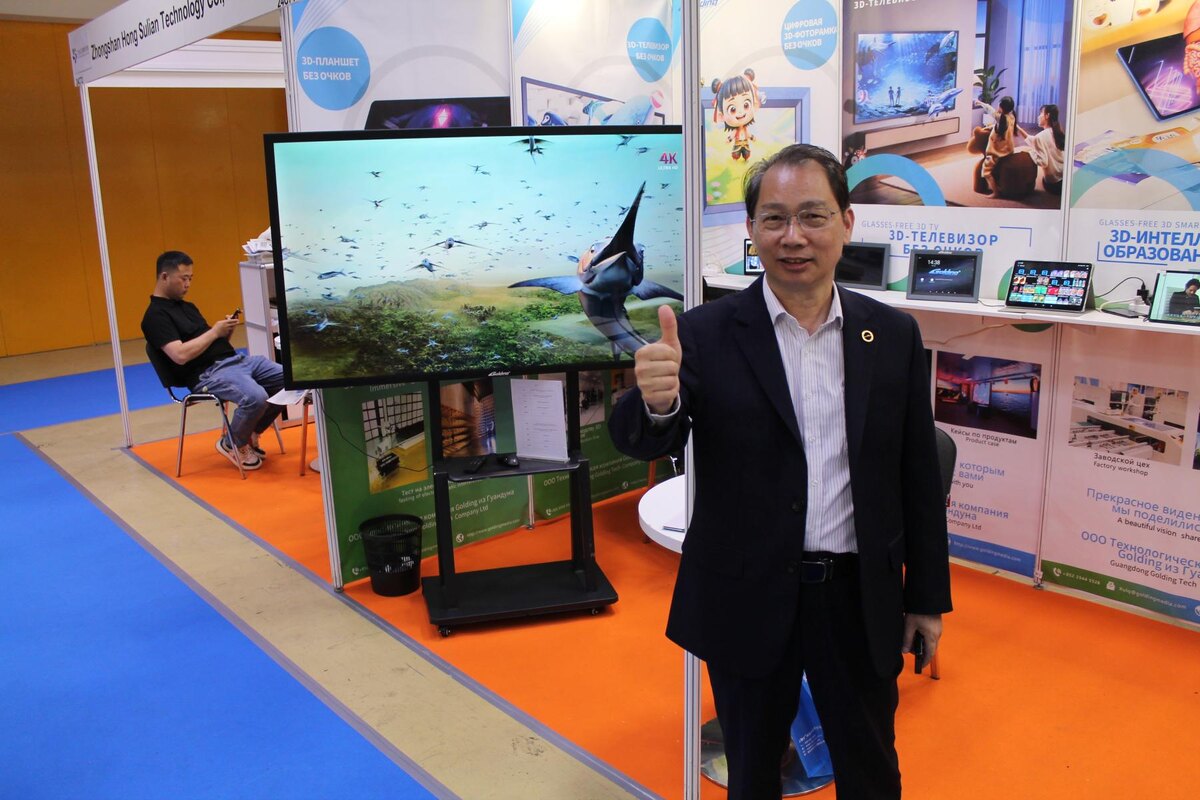 Представитель компании Guangdong Golding Technology на фоне телевизора с объёмным изображением