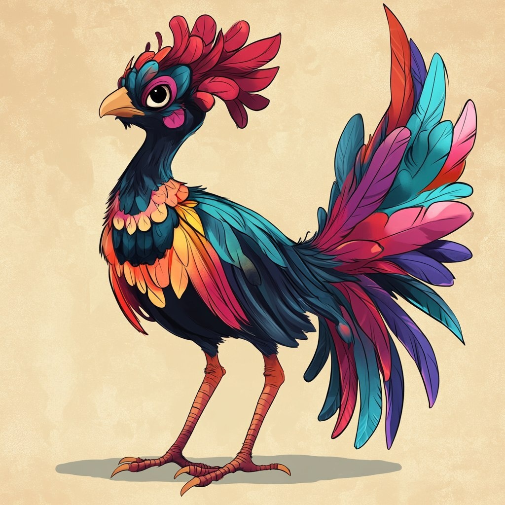 Создано на основе запроса: manga style a tukey like bird with 4 eyes and beautiful colors it stands strong and has no wings