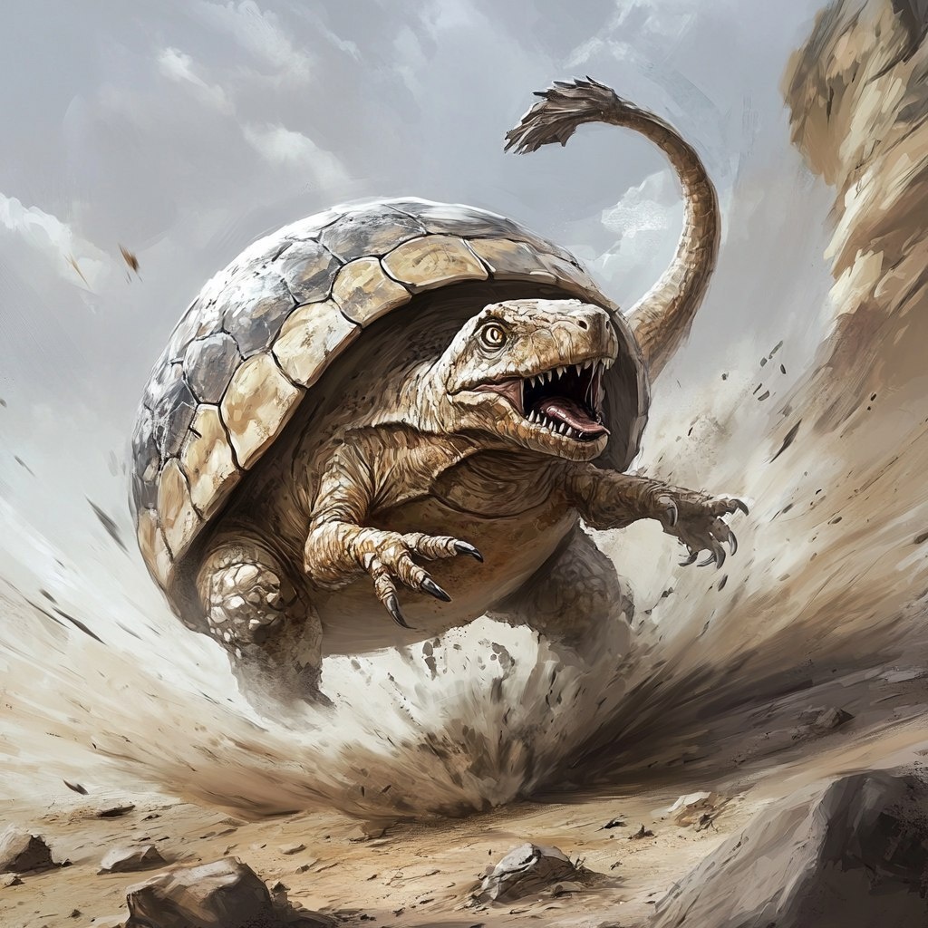 Создано на основе запроса: Ark Survival Ascended Doedicurus. A small, round shell dinosaur with a tiny head protruding from the shell and a tail with a flail on the end. It is angry and swinging its tail to smash a rock --- Автоперевод: Выживание Арка поднялось додикурусом. Классно получилось? 🤔 https://dzen.ru/id/65c0c65c86e4f837c27b24d7 #ИИ #AI #нейросеть #midjourney #art