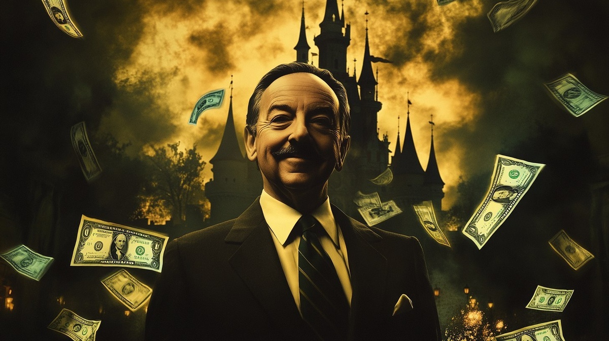Создано на основе запроса: Walt Disney standing confidently with a mischievous smirk, dollar bills raining down, dark castle silhouette in