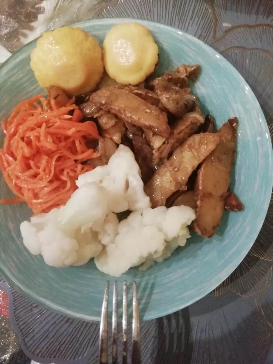 Хочу поделиться рецептом, который сам собой возник в дни Великого поста. Берем 1 луковицу режем как нравиться. Я обычно режу 1/4 кольцами. На сковороду без масла наливаем соевое масло примерно 3-4 столовые ложки, разогреваем и кладем лук. Лук впитывает соевое масло и обжаривается в нем. Добавляем в сковороду приправы под рукой (по вкусу, на глаз, по предпочтениям): розмарин, тмин, душицу, можно немного адыгейкой соли (чуть-чуть, т.к. соевый соус соленый). Добавляем картофель. Жарим до готовности с накрытой крышкой. Я масло не добавляла, но все зависит от сковороды - если нужно, то добавьте. Выкладываем на тарелку. Можно подавать с морковкой по-корейки, маринованными баклажанами и в моем случае, с вареной цветной капустой (10 минут в кипящей воде с солью и охладила в холодной воде). Вкусно, питательно, сытно и полезно. Приятного аппетита!