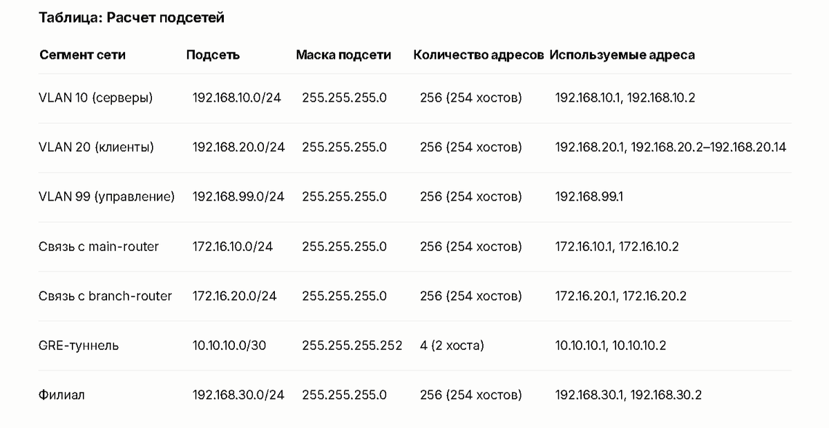 Почему /24? Упрощает управление и предоставляет больше адресов для клиентов. - VLAN 99 (управление): Требуется до 8 адресов.Маска: /24 (256 адресов, 254 для хостов).
