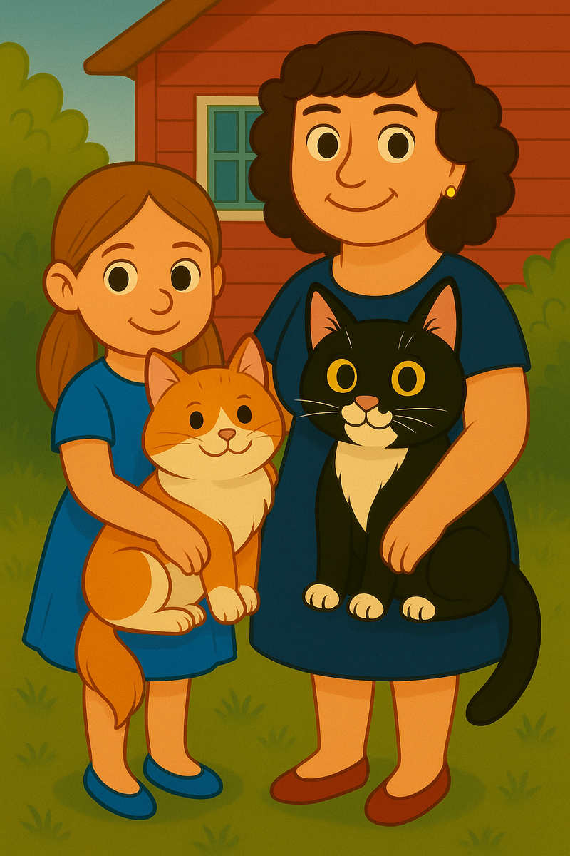 Жила-была девочка по имени Поля. Ей было шесть лет, но совсем скоро — ей исполниться семь, и тогда она пойдет в школу. С Полей жил удивительный кот по имени Джойс. Он был белый, как облачко, но с рыжим хвостом, рыжей спинкой и ушками, будто кто-то аккуратно обмакнул его в апельсиновую краску. Соседи знали Джойса. Некоторые шептались: — Это тот кот, что с помойки? Но Поля сердито поправляла: — Не он себя на помойке нашёл! Это мы его там нашли. Он просто потерялся и ждал, пока его кто-то заберёт. Однажды бабушка Лена, которая жила в деревне в Подмосковье, пригласила Полю в гости. — Приезжай, Полечка, — говорила она. — И Джойса бери! А у нас тут кот Барон — ух, важный! Он всех кошек в округе знает и всё про всех расскажет. Поля села на электричку вместе с Джойсом в переноске, и началось их приключение. По дороге Джойс ворчал: — Мяу. Надеюсь, этот Барон не какой-нибудь хвастун... Но Барон оказался котом представительным: чёрный, как ночь, с белой грудкой, как у официанта, и с белыми пят