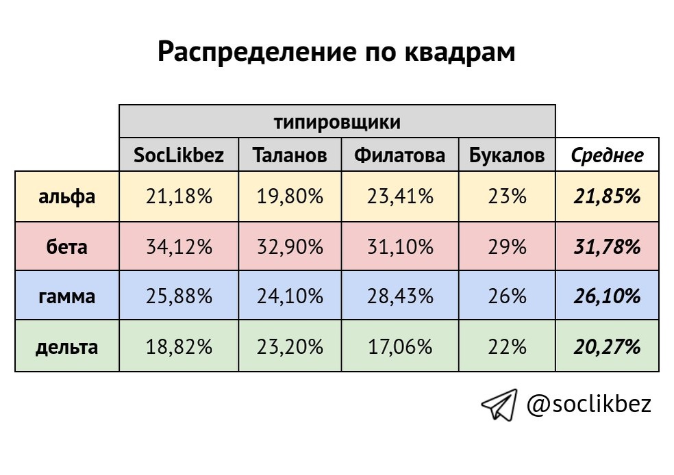 Для ответа на этот вопрос мы обработали свою статистику протипированных людей и статистику некоторых других социоников: Таланова Филатовой Букалова Оценки от разных социоников различаются, но прослеживается и общая тенденция. Получилось, что квадры распределены в некоторой степени неравномерно, но перекосы не очень сильные. Нет такого, чтобы какая-нибудь одна квадра подавляюще преобладала, а другой практически не было. Также у всех социоников больше всего получилось квадры бета, квадра гамма - на втором месте. У всех, кроме Таланова на 3 месте по численности - квадра альфа, на 4 - квадра дельта. У Таланова на 3 месте - квадра дельта, на 4 - квадра альфа. Как думаете, каковы причины подобной разницы в численности квадр у разных типировщиков? Ждём Ваших предположений в комментариях.
