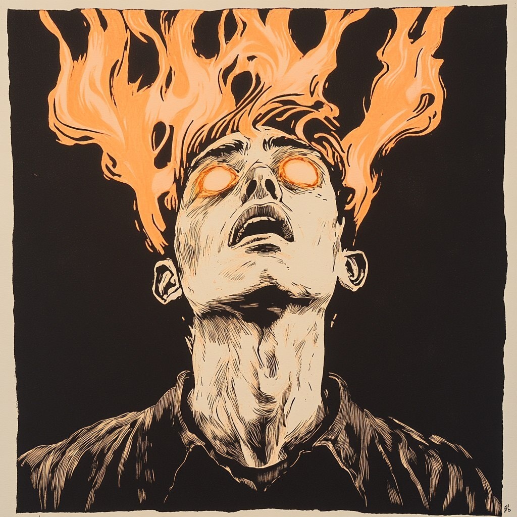 Создано на основе запроса: Linocut print of a slack jawed man looking up with magic flames pouring from his eyes