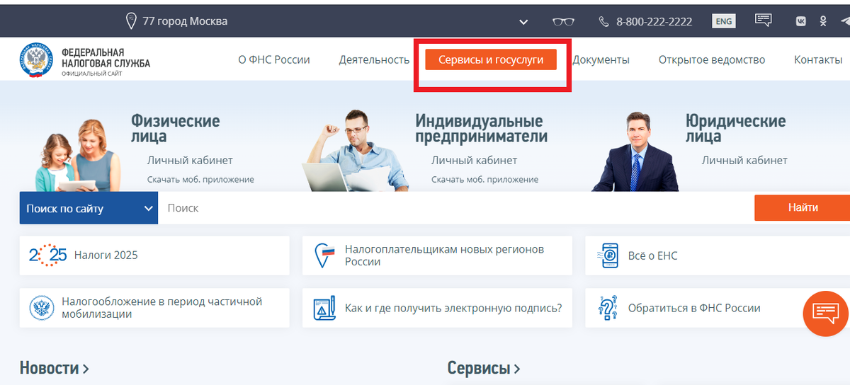 Посмотрим пошаговый механизм. Заходите на сайте ФНС, у них вверху есть кнопка "Сервисы и услуги".