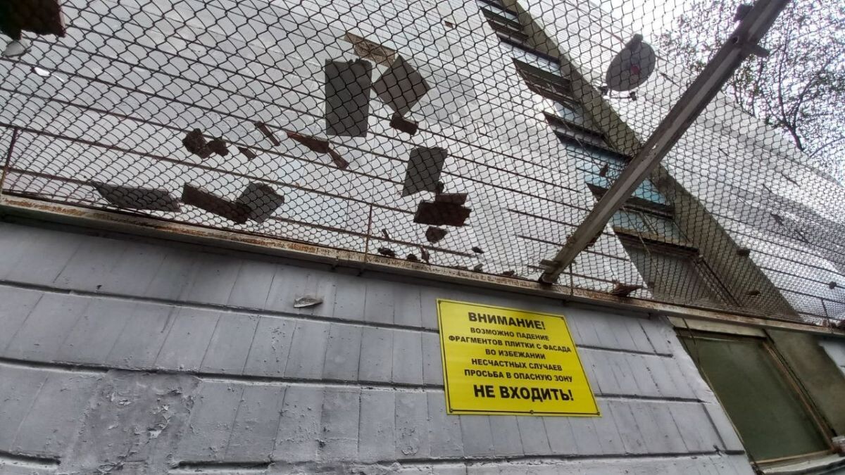 Плитка с фасада здания в Воронеже продолжает угрожающе обрушиваться на защитную сетку
