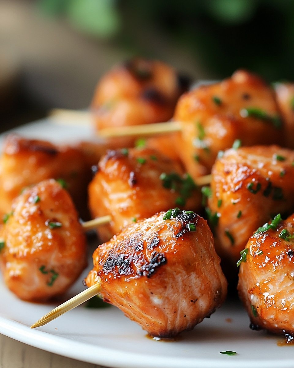 Создано на основе запроса: Title: Salmon Bites | Close-up Shot right view, taken by a photographer with a high quality camera, served on a white plate, background of kitchen, very tasty, delicious, homemade, without any text, words or writing