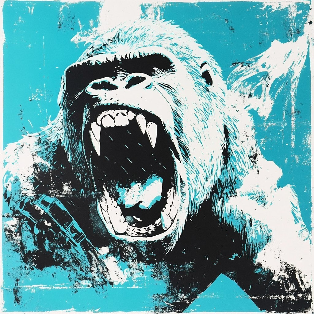 Создано на основе запроса: King Kong eats Gymshark, Full Body, screen printed, two-tone, turquoise and white, wild, abstract