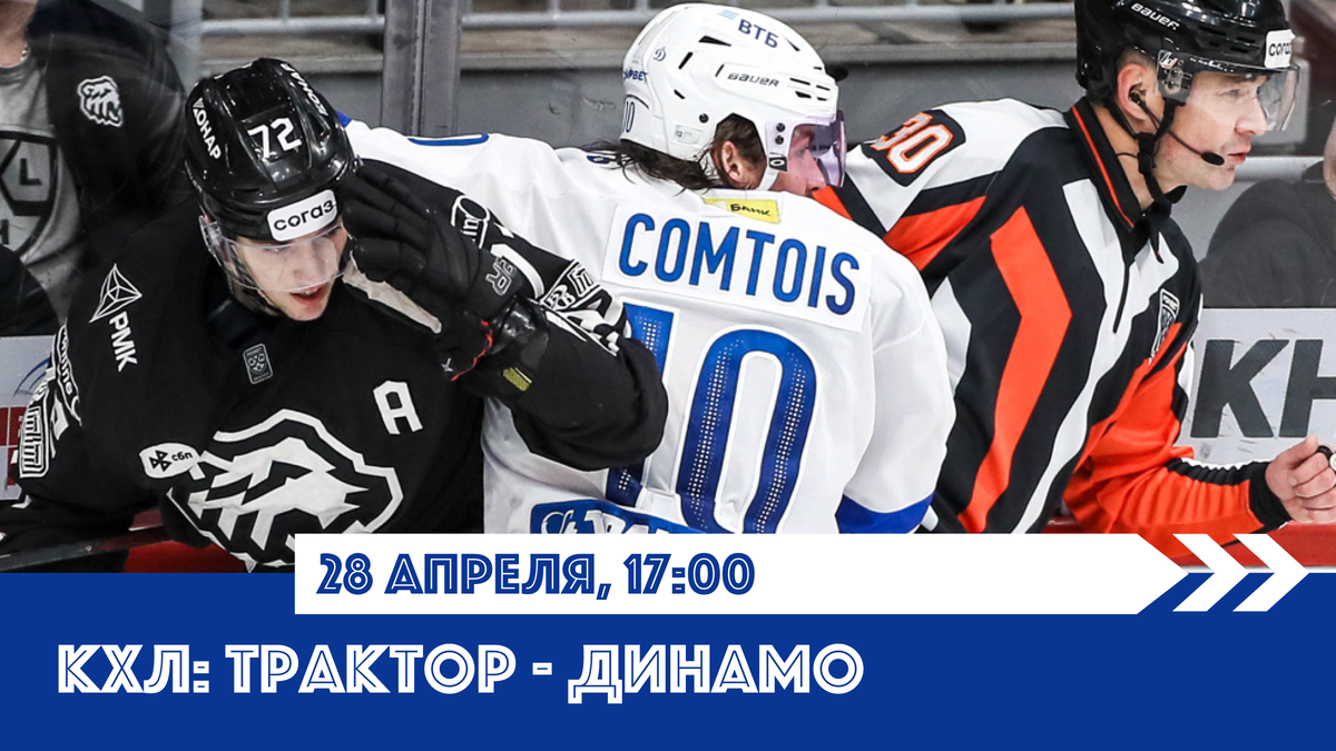 В понедельник, 28 апреля, состоится матч полуфинала плей-офф Кубка Гагарина между «Трактором» и московским «Динамо». Встреча пройдёт в Челябинске на стадионе «Арена-Трактор имени Валерия Белоусова» в 17:00 по московскому времени. В прямом эфире игру покажет онлайн-сервис «Кинопоиск».