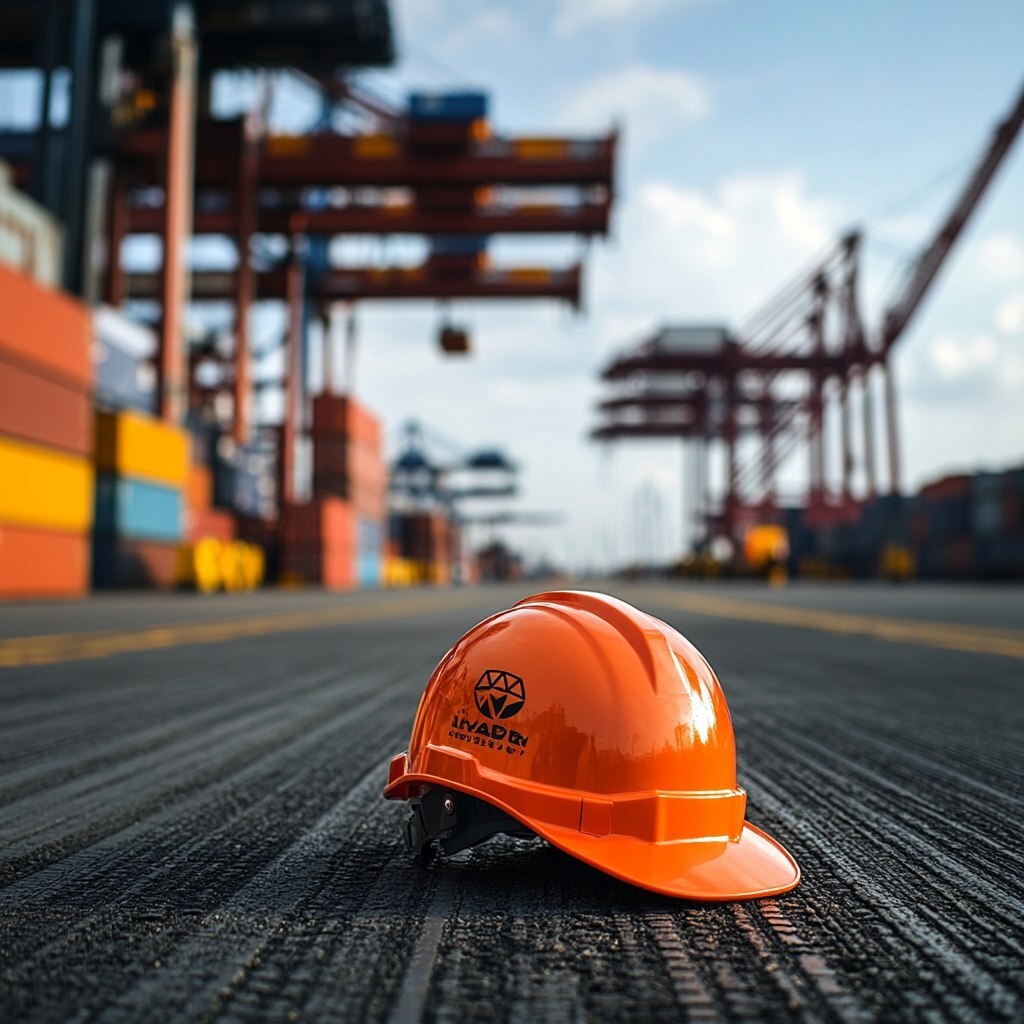 Создано на основе запроса: port workers service helmet on the port floor, with shipping containers at the background, helmets slightly back