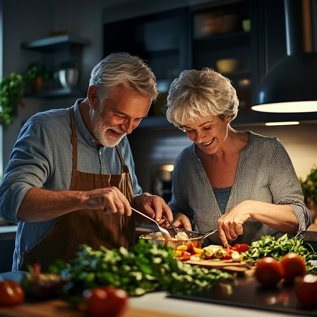 Создано на основе запроса: a retired couple preparing food on a kitchen island, looking down, low angle, close-up, smiling, 12 noon, ambient