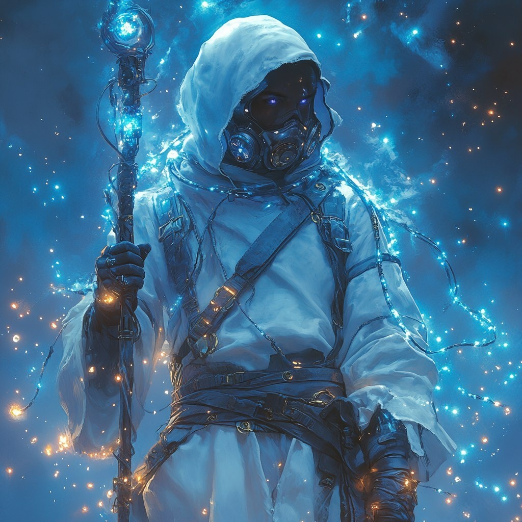 Создано на основе запроса: Technological mage wearing an oxygen mask, glowing runes on his staff, futuristic and mystical atmosphere, drawn