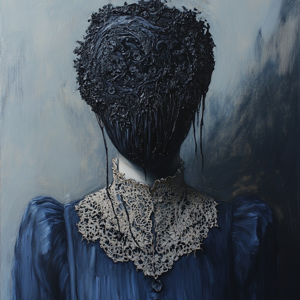 Создано на основе запроса: Oil painting in the style of Nicola Samori and Eliran Kantor, a creepy Victorian woman with her head covered in black slime mold, a lace collar on a dark blue dress. --- Автоперевод: Масляная живопись в стиле Никола Самори и Элирана Кантора, жуткой викторианской женщины с головой, покрытой черной слизистой плесенью, кружевным воротником на темно -синем платье. Хорошо выглядит? 🤔 https://dzen.ru/id/65c0c65c86e4f837c27b24d7 #ИИ #AI #нейросеть #midjourney #art