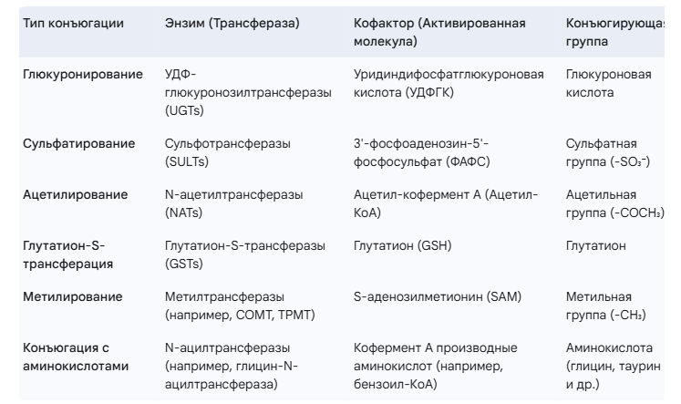 Конъюгация (фаза II биотрансформации) — это метаболический процесс, происходящий в организме, в ходе которого молекулы, образовавшиеся на первом этапе биотрансформации (фазе I), или некоторые исходные вещества, соединяются (конъюгируют) с эндогенными (внутренними) молекулами. Основная цель конъюгации — сделать вещества более водорастворимыми (гидрофильными) и, следовательно, более легкими для выведения из организма с мочой или желчью. Кроме того, конъюгация часто приводит к инактивации лекарств и токсинов, хотя в некоторых случаях может образовываться фармакологически активный метаболит или даже токсичное соединение. Основные характеристики фазы конъюгации: Основные типы реакций конъюгации и соответствующие ферменты и кофакторы: Примеры веществ, подвергающихся конъюгации: Значение фазы конъюгации: Фаза конъюгации играет ключевую роль в детоксикации организма и элиминации эндогенных и экзогенных веществ. Нарушения в работе ферментов фазы II могут приводить к накоплению токсичных метабол