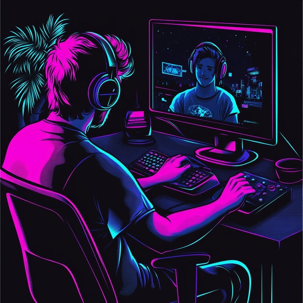 Создано на основе запроса: 80's retro image using neon colors illustrating a cartoon character in their 30's on a video call with a cool looking guy, while sitting at their video game desk, with a black background. Make it look cool and hip.** - Image** - (fast) --- Автоперевод: Retro Image 80 -х, используя неоновые цвета, иллюстрирующие мультипликационного персонажа в возрасте 30 лет на видеозвонке с крутым парнем, сидя за своим видеоиграми, с черным фоном. Неплохо вышло? 🤔 https://dzen.ru/id/65c0c65c86e4f837c27b24d7 #ИИ #AI #нейросеть #midjourney #art