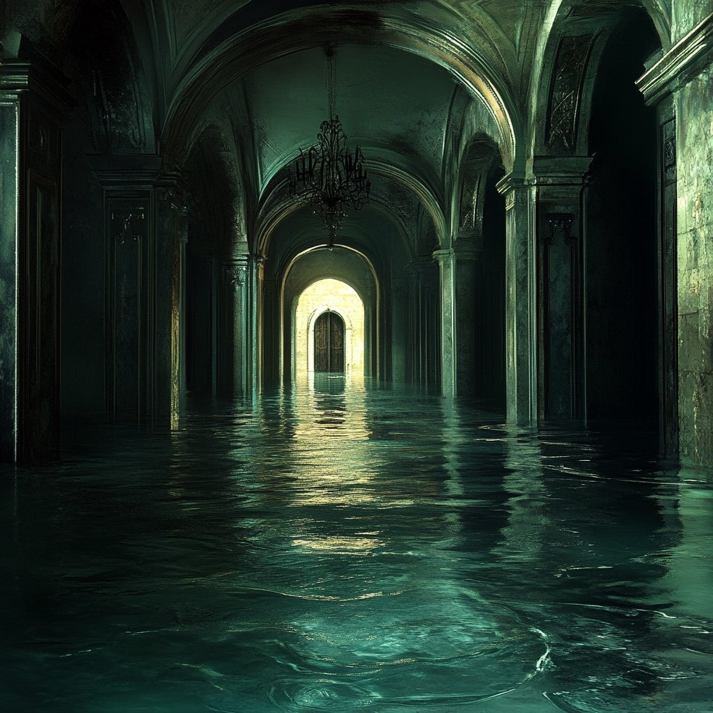 Создано на основе запроса: a hallway decending into water, flooded, fantasy setting