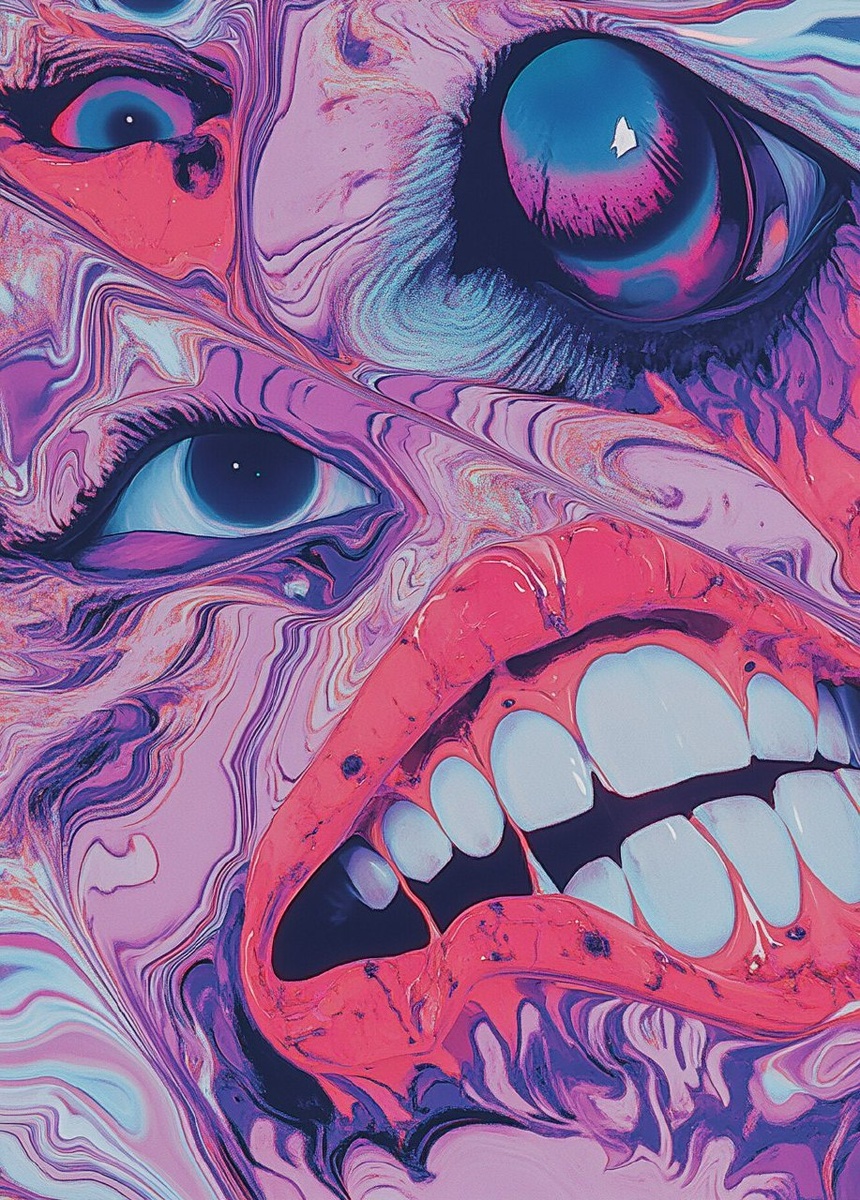 Создано на основе запроса: Close-up of an anime-style pattern on the screen, the patterns have eyes and mouths with teeth. The colors are pink, red, purple, and blue. Aesthetically pleasing, with a film grain effect, highly detailed, glitch art, colorful, and psychedelic. --- Автоперевод: Крупный план аниме-рисунка на экране, узоры имеют глаза и рты с зубами. Как тебе такая картинка? 🤔 https://dzen.ru/id/65c0c65c86e4f837c27b24d7 #ИИ #AI #нейросеть #midjourney #art