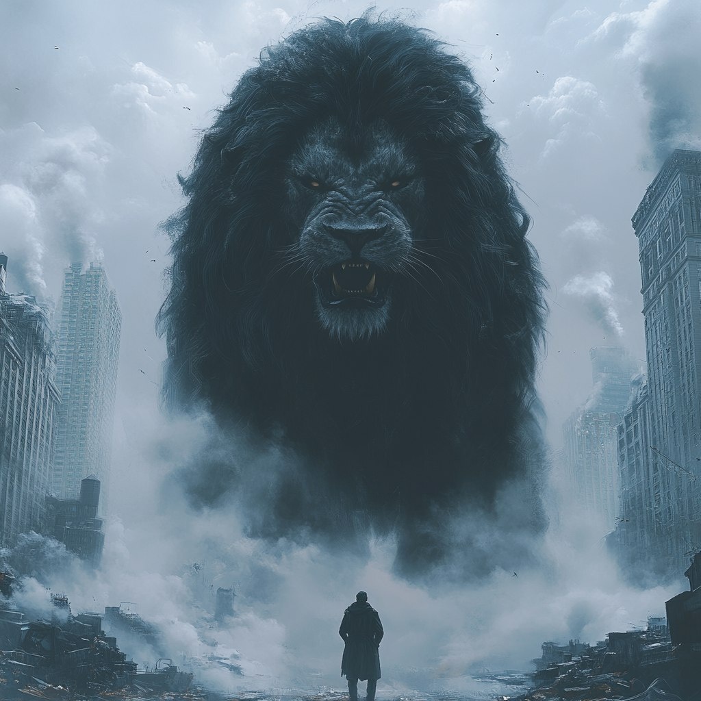 Создано на основе запроса: giant black lion, standing in the city surrounded by fog and mist, man walking towards it from behind, fantasy