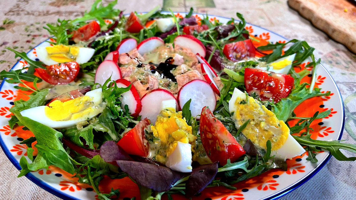 Я уверена … что у каждой хозяйки на кухне есть своя маленькая пещера Сезам - да, та самая полка … или шкафчик, где в вечном ожидании «чёрного дня» дремлют консервы, баночки с соленьями, соусами, вареньем и прочим кухонным реквизитом. Наверно это наследие нашего социалистического прошлого … знаете ли … и когда мы прячем туда очередную банку шпротов … голоса наших предков в подсознании … начинают бурно аплодировать. Так вот, друзья … я настоятельно рекомендую время от времени проводить там ревизию. И вот … в один из таких моментов, мне на глаза попалась та самая банка - скромная, неприметная, но с характером. «Тунец … - подумала я. - А не сделать ли нам салат по-нисуазски?» … но мы же русские, а значит, даже французскую классику надо обставить с размахом, добавив в неё частичку нашей широкой русской души … а еще щепотку хаоса и пару хвостатых дегустаторов, готовых устроить кулинарный переполох. И так … я объявляю сегодня праздник отечественной консервной промышленности! Ведь если не мы,