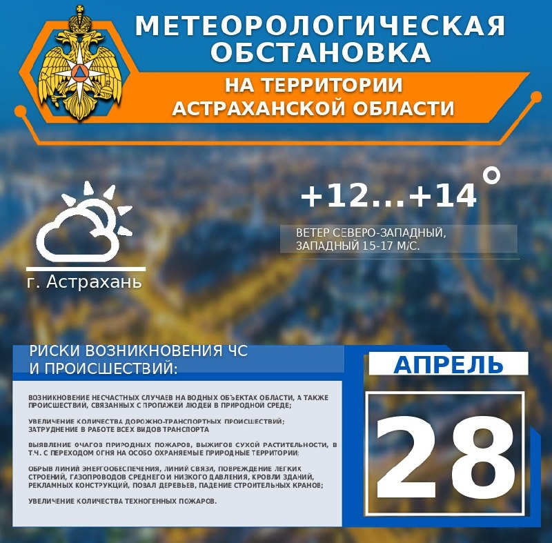 🌱Метеорологическая обстановка на 28 апреля. ⛅️На территории области переменная облачность. 🌧Местами небольшой дождь. Ветер северо-западный, западный 9-14 м/с, местами порывами 15-18 м/с. 🌡Температура воздуха +10...+15°. ⛅️По г. Астрахань переменная облачность. Без существенных осадков. Ветер северо-западный, западный 15-17 м/с. 🌡Температура воздуха +12...+14°.