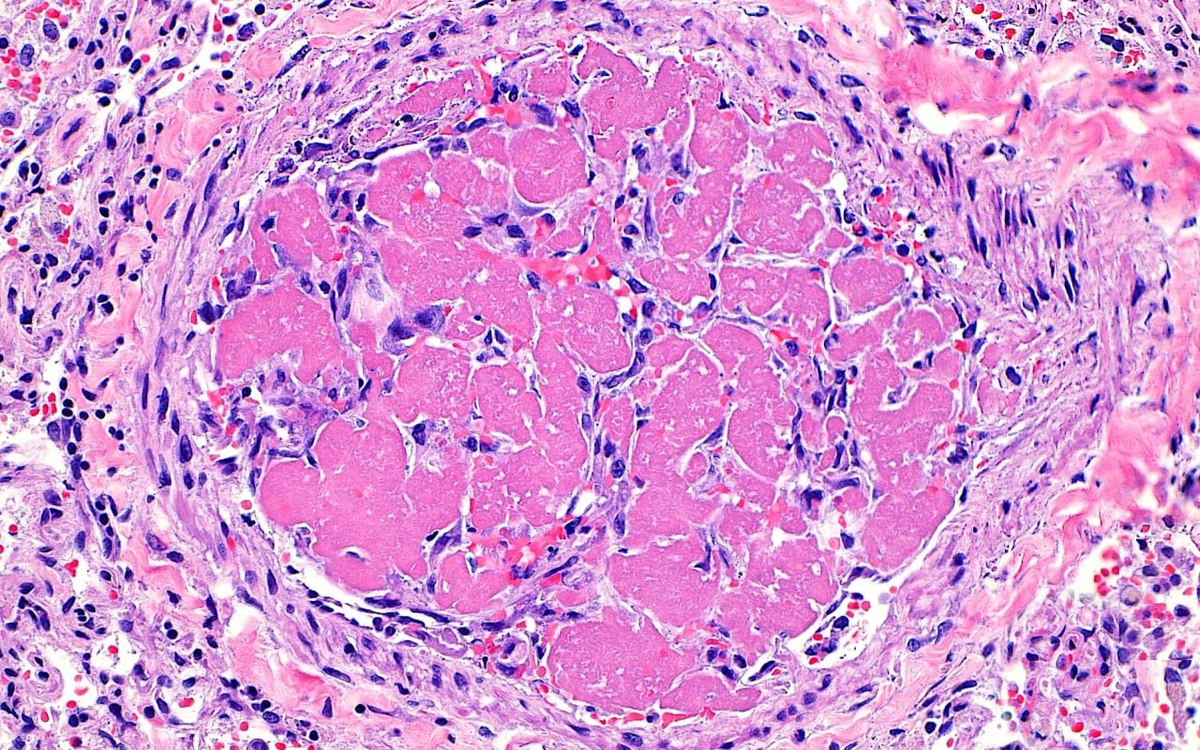 Фибрин (ярко-розовый) и фибробласты (синие точки) в сосуде (крупная структура по форме близкая к окружности).