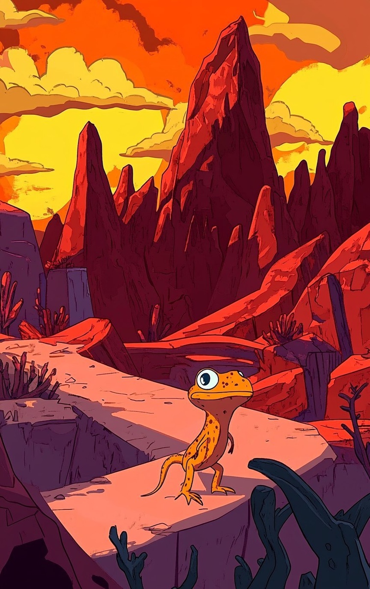 Создано на основе запроса: close up view of red rock mountains, a dumb fish eyed lizard stands nearby, silly cartoon pop art, solid colors