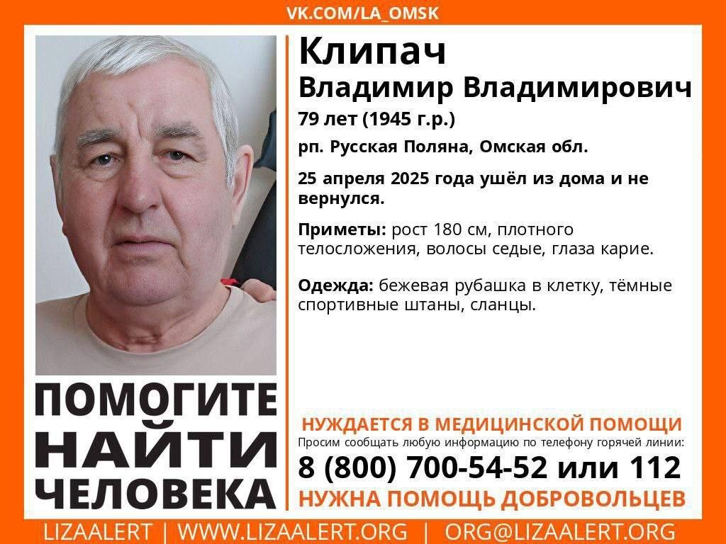 Мужчина передвигается медленно и страдает серьезными проблемами со здоровьем. С 25 апреля волонтеры поискового отряда «ЛизаАлерт» активно разыскивают пропавшего жителя поселка Русская Поляна Омской области, 79-летнего Владимира Клипача. Последний раз пенсионера видели днем 25 апреля, когда он проводил свою гостившую родственницу, а потом бесследно исчез. Владимир Владимирович страдает серьезными проблемами со здоровьем, передвигается крайне медленно и вряд ли сможет самостоятельно вернуться домой. Его физическое состояние требует срочной медицинской помощи, и каждая минута промедления критична. Волонтеры ищут пожилого мужчину в окрестностях поселка и призывают всех неравнодушных присоединиться к поиску. Особые приметы: рост 180 см, плотное телосложение, седые волосы, карие глаза. Был одет в бежевую рубашку в клетку, темные спортивные штаны и сланцы. Если вам встретится мужчина похожего возраста и внешности, немедленно свяжитесь с координатором поисков Еленой по номеру телефона +7 (960)