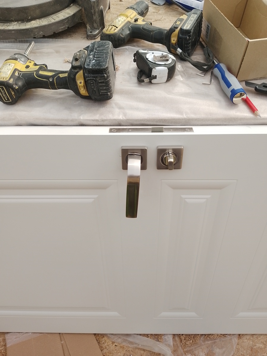 Здравствуйте! Продолжаем работать на каркасном доме. Вот и подошло дело до установке дверей и наклейке обоев. С наклейкой обоев пусть напарник справляется, очень уж не нравится мне это дело, а вот установка дверей, самое то. Двери от Российской компании Албео. Довольно неплохие. Раньше в дверях была хоть какая то рамка из дерева, теперь нет. Полностью из древесного волокла. Прямо насквозь. Довольно таки не тяжелые. Эти двери без пленки. Эмаль. Белая. Потому и относился к ней очень аккуратно. Если будет скол, то беда. Пленку еще можно аккуратно подклеить, здесь, вариантов нет. С замками, защелками не заморачивались. Хоть и в дверном магазине и большой выбор, но выбирать по телефону, по фотографиям, удаленно, как то так себе идея. Так что забрал, заказанные заказчиками, ручки замки с маркетплейса. Комплект. Шарниры бабочки, замок, ручки. Ну и устанавливал, опять же привезя полбагажника инструмента. тут и дрель, сверлить под замок, и шуруповерт, сверлить под шурупы, саморезами компле
