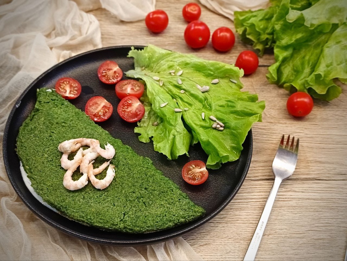 🥚🥦Омлет со шпинатом и креветками ✔️Ингредиенты: на 3-4 порции Яйца 6 шт. Шпинат замороженный 250 г. Молоко 250 мл. Сыр творожный 140г. Черри 12 шт. Листовой салат 4 листа. Креветки 28 шт. Семена подсолнуха 20г. Масло оливковое 1 ст. л. Сливочное масло 10г. Соль по вкусу. 🔪Приготовление: Шпинат и креветки предварительно разморозить. Креветки очистить. Шпинат отжать от лишней жидкости. Смешать шпинат с яйцами, 200 мл. молока и солью. Измельчить погружным блендером до однородной массы. На сковороде растопить сливочное масло, добавить оливковое. Вылить на сковороду яичную смесь. Накрыть крышкой. Довести до готовности на небольшом нагреве. Творожный сыр смешать с 50 мл. молока. 🍴Подача: На тарелку выложить листья салата и половинки черри. Посыпать семечками. На свободную область тарелки намазать творожный сыр. Сверху положить омлет. На омлет выложить креветки. Приятного аппетита! #вкуснозавтраки@vkusnoraz