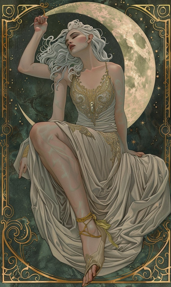 Создано на основе запроса: a photo realistic modern art nouveau illustration of a beautifule woman she has flowing silver hair, her face is similar to Kiernan Shipka, she is lounging on a crescent moon, her long gown hangs down covering her legs exposing on one foot, the gown is pearl colored and has intricate gold patterns and ornate accents, there is an ethereal glow around her, the illustration is framed with a circular element with stars and organic elements in greens and golds, ultra detailed --- Автоперевод: Фотография реалистичная современная искусство иллюстрация красивой женщины, у нее текучивой серебряной волосы, ее лицо похоже на Киернан Шипка, она бездельничает на полумесяце, ее длинное платье висит вниз, покрывая ее ноги, обнажая эл. Отлично выглядит? 🤔 https://dzen.ru/id/65c0c65c86e4f837c27b24d7 #ИИ #AI #нейросеть #midjourney #art