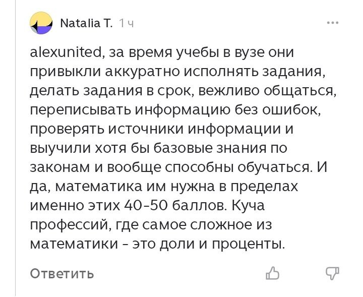 Не так давно написал статью, в которой выражал недоумение по поводу тех выпускников, которые на ЕГЭ по математике профильного уровня с трудом переваливают детсадовский порог в 27 баллов (зачастую - не с первой попытки, несмотря на подготовку с репетитором), но по достижении 34-40 баллов идут с этими баллами в технические вузы, получают в них диплом инженера и потом устраиваются на работу, для которой из всего их высшего образования требуется лишь диплом. Или не требуется. Я так толком и не понял. Но суть в том, что все эти люди, со скрипом сдающие ЕГЭ, тем не менее сдают его, чтобы пойти с этими неприлично низкими баллами в вуз, в который их возьмут.