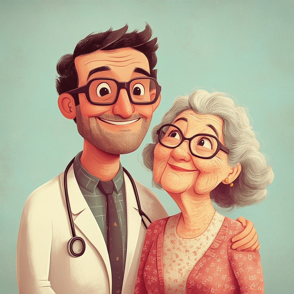 Создано на основе запроса: generate a organic style ilustration of a 40 year old doctor with dark hair and glasses and his old lady patien