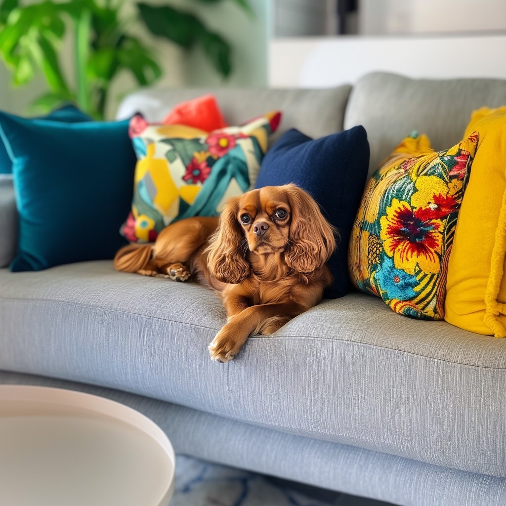 Создано на основе запроса: a brown cavalier king charles spaniel lying on a couch with a few colorful pillows and looking at the camera