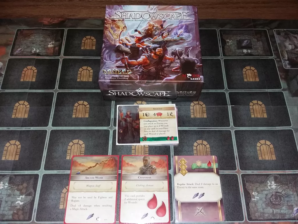Один из самых быстрых и компактных (в плане размеров коробки - так-то поле довольно много места занимает) карточных данжен кроулеров. Боевка простая и безрандомная - просто столько урона сколько на карте действия. Другие действия тоже осуществляются с карт. Их всего четыре в руке, но после применения они переворачиваются заменяясь на другое действие а ля Champions of Hara, плюс их можно усилить картами судьбы (довольно ценный ресурс, их много не бывает), так что в теории есть над чем подумать каждый ход. На практике игра все равно неглубокая. Режимов два - соревновательный и кооперативный. Второй куда менее интересный из-за малого взаимодействия; в кооперативном есть довольно фановые карты, натравливающие на соперников монстров, меняющие местами комнаты - в общем всячески пакостящие. В целом... пара неплохих идей тут есть, но играть совсем неинтересно. Слишком долгая для филлера, слишком примитивная для игры посерьезнее. Плюс унылый однообразный арт, большое по большей части пустое под